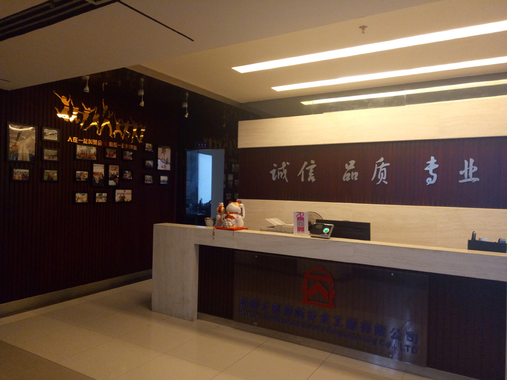 海南大凱消防安全工程有限公司于2011年4月7日經海口市工商行政管理局批準成立,現公司部門辦公室區域分為前臺、財務室、會議室、總公辦、工程部、總經理辦公室、檢測部幾大塊。辦公環境干凈整齊、舒適,為員工營造了一個良好的辦公環境。