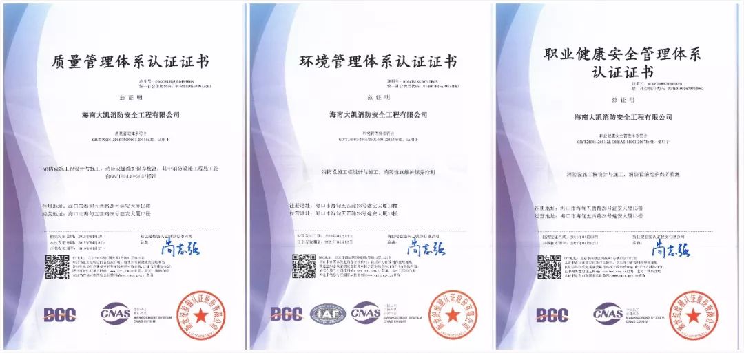 經新世紀檢驗股份有限公司對海南大凱消防安全工程有限公司質量、環境、職業健康安全管理三體系運行現狀深入細致的審核和總結,專家組一致認定大凱消防“三體系”運行狀況良好,符合體系復審要求,給予順利通過。